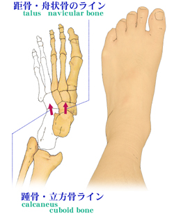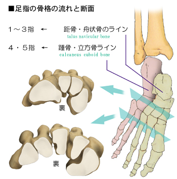 足首は、距骨と踵骨という2つの骨が縦に積み重なった構造をしています。上側の距骨からは、第1〜3指につらなる内側のラインが生まれ、下側の踵骨からは、第4・5指にいたる外側ラインが生まれます。