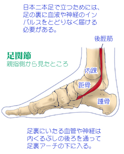 青竹踏みをしてとても痛い思いをした経験をしたことがありませんか? 立って二本足で歩くとたえず足裏の筋肉に負担がかかります。足先に向かう血管と神経は内くるぶしの後ろをとおって足裏に入ります。